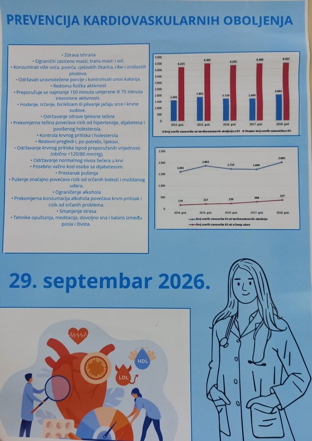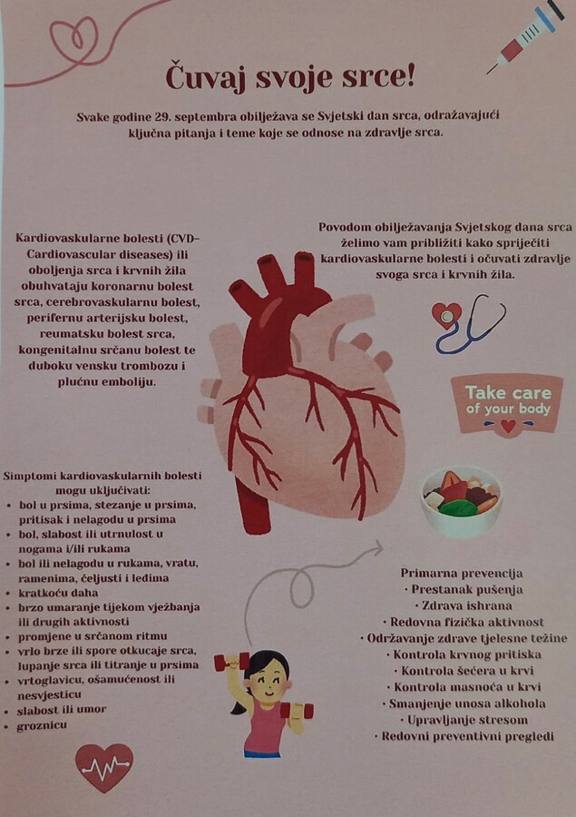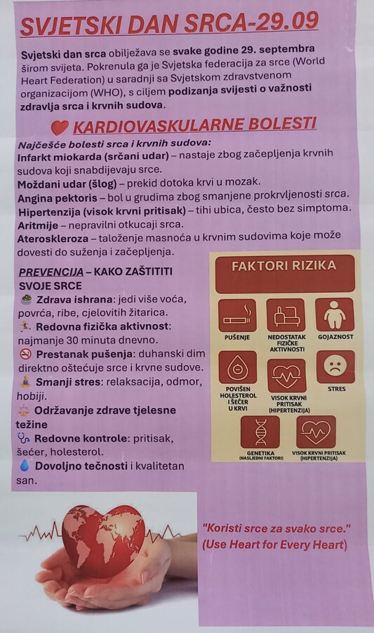 Svjetski dan srca obilježava se svake godine 29. septembra s ciljem podizanja svijesti o kardiovaskularnim bolestima (KVB), koje uključuju bolesti srca i moždani udar, a vodeći su uzrok smrtnosti u svijetu. Ovaj dan je globalna inicijativa koja potiče ljude da poduzmu preventivne mjere, poput zdravije prehrane, tjelesne aktivnosti, izbjegavanja duhana i štetne upotrebe alkohola, kako bi se smanjio broj oboljelih i umrlih od KVB-a. Tema za 2025. godinu je "Ostani u ritmu", koja naglašava važnost stalne brige o zdravlju srca, prepoznavanja znakova upozorenja i pravovremene medicinske intervencije.